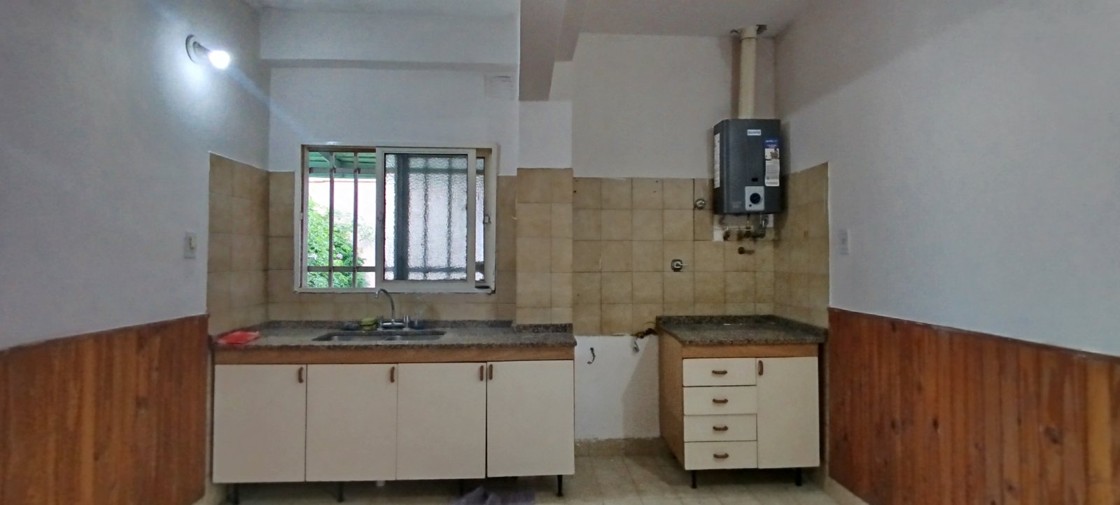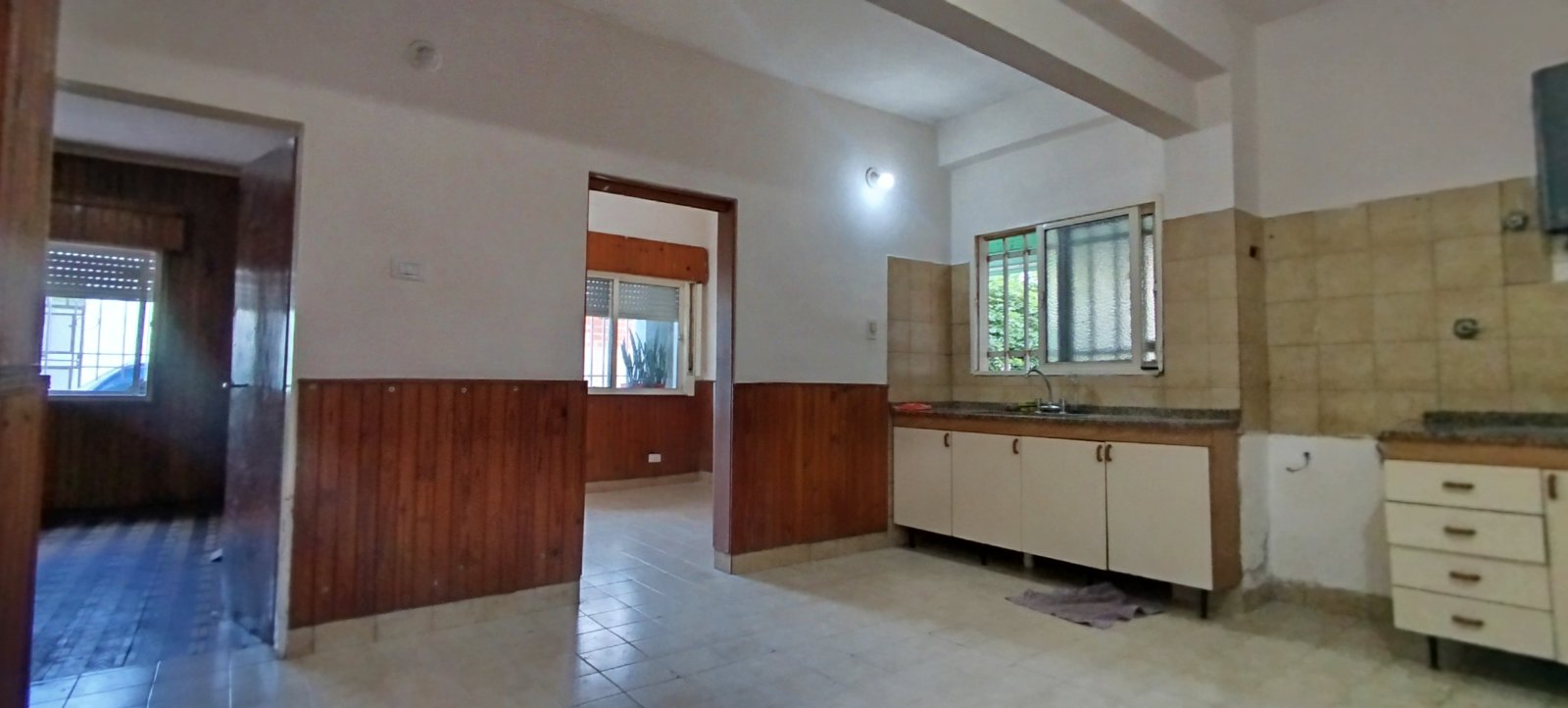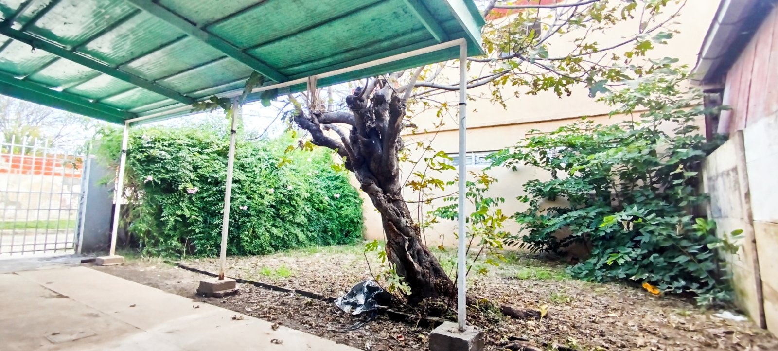 Casa de un dormitorio con ventanal a la calle. Living con pisos de ceramicos y ventanal a la calle. Cocina con mesada, bajo mesada y calefon. No tiene aparato de cocina. El baño es completo sin bañera. Dos patios. Uno de los patios es con cochera semi-descubierta. Sup cubierta 56m2 Sup Terreno 210 m2